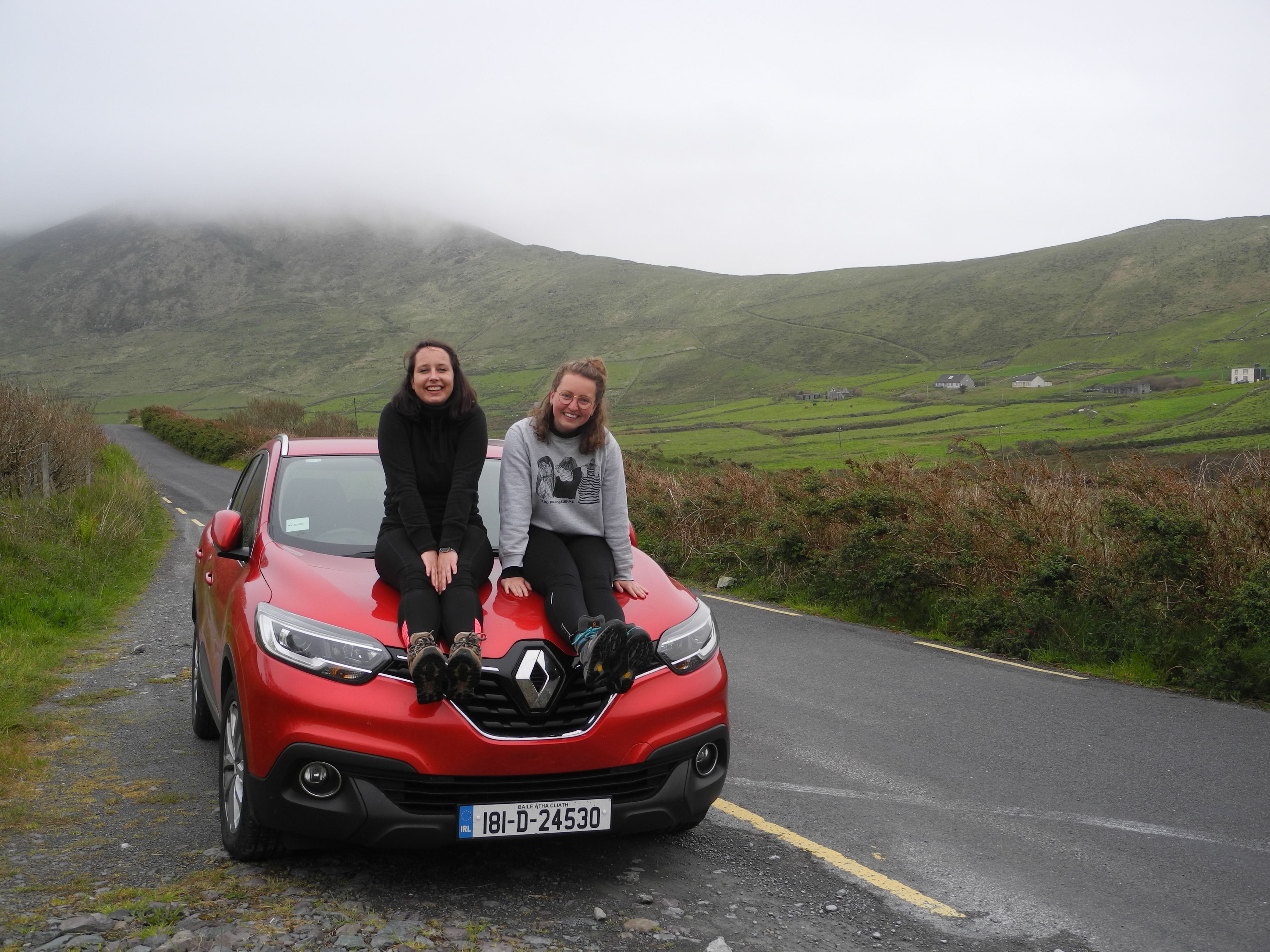 In Killarney, einem kleinen Ort in der Nähe des berühmten Ring of Kerry, haben wir also ein Auto ausgeliehen und netterweise noch ein kostenloses Upgrade bekommen, sodass wir schlussendlich mit einer riesigen Familienkarre (genannt „das Schiff“) über die unfassbar schmalen irischen Landstraßen der Halbinseln Dingle und Iveragh gedüst sind. Das Fahren war für mich doppelt anstrengend, denn nicht nur musste ich ständig schauen, nicht rechts und (vor allem) links sämtliche Büsche und Bordsteine mitzunehmen, sondern eben auch den Linksverkehr in meinen Kopf zu bekommen (und auch noch am dritten Tag griff die rechte Hand beim Schalten immer wieder ins Leere…). Gleich auf unserer ersten Fahrt haben wir auch noch einen Anhalter mitgenommen, der sich wahrscheinlich auch um sein Leben gefürchtet, sich aber nichts anmerken lassen hat.